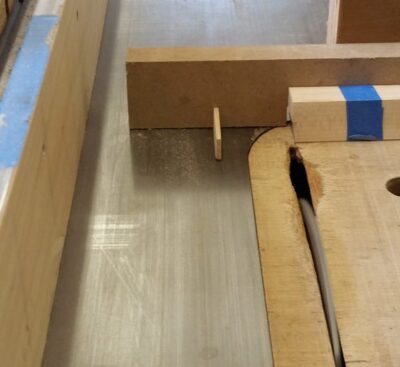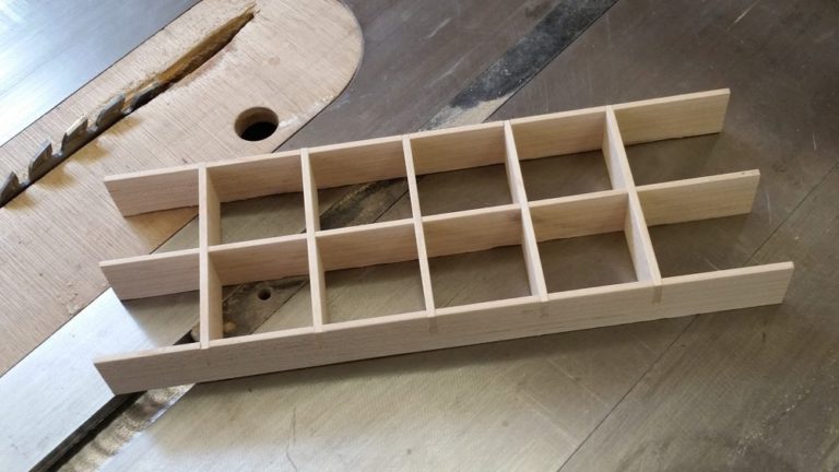 Set the blade height exactly half the width of the divider pieces, in this case 1/2″. Use a test piece to get it right. This insures that the parts go together properly, any error doubles.