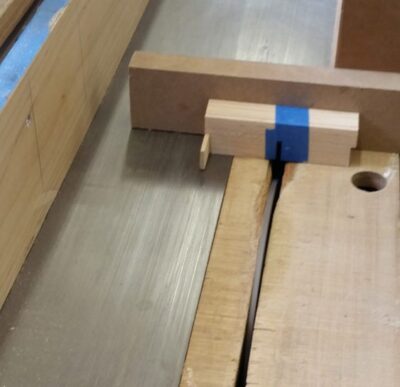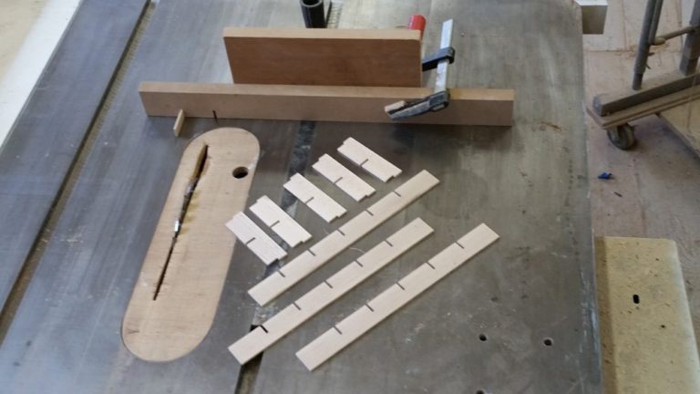 I chose a regular carbide saw blade for the work, it makes a cut about 1/8″ wide. Take a piece of scrap wood about 3/4″x2″x10″ and using a miter attachment make a test cut to establish the exact width of your saw cut.