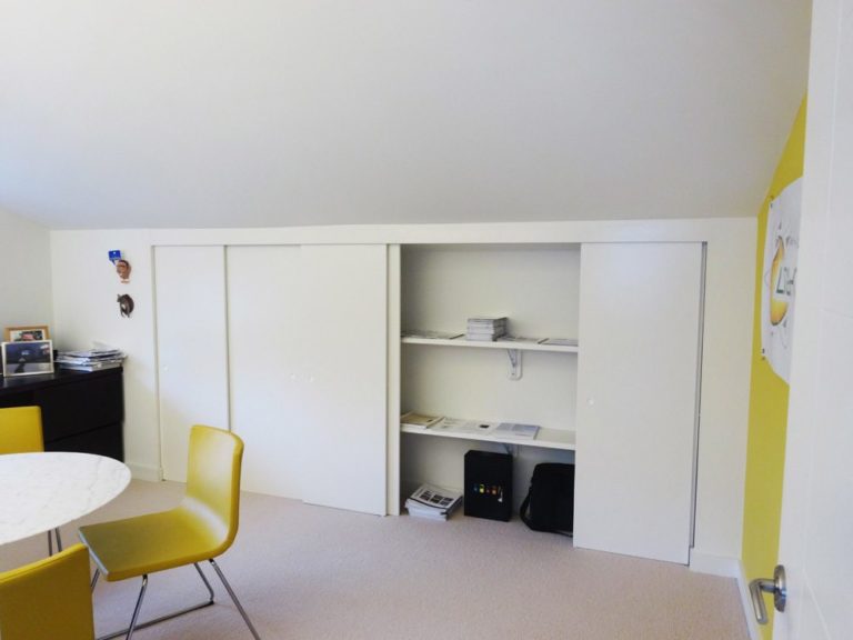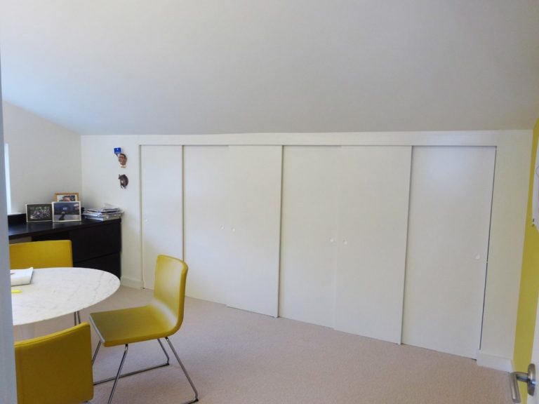 The sliding doors ride on a commercial grade track system mounted on a custom door head fitted to the sloping ceiling. The 6 doors ride on top quality ball bearing carriers for  years of effortless opening and closing.