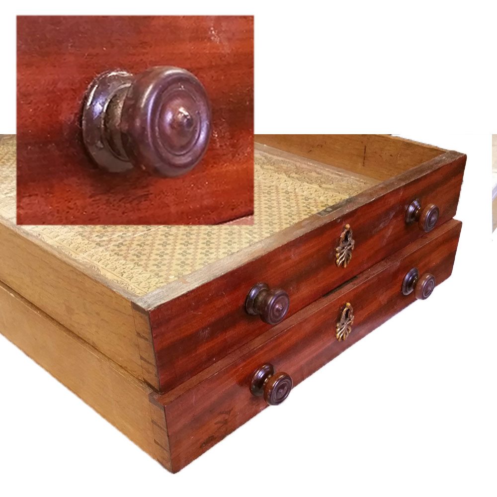 Several of the knobs on the drawers had been broken and lost over time and needed to be replaced. To keep the integrity, and the value of the desk, the knobs had to be turned in the right wood, and had match the size and shape of the originals exactly.
